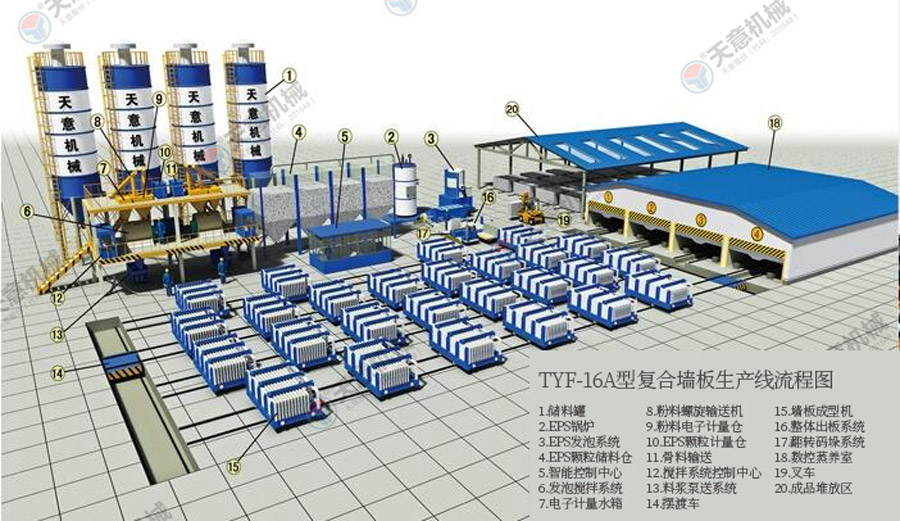 TY12型墻板生產(chǎn)線包括:墻板成型機、整體穿抽管系統(tǒng)、發(fā)泡系統(tǒng)、水箱、電子計量儲料倉、螺旋上料輸送機、儲料罐、螺旋輸送機、EPS熟化料倉、硫化干燥床、EPS預(yù)發(fā)機、數(shù)控配電室、發(fā)泡攪拌機、整體出板系統(tǒng)、叉車、成品堆放區(qū)、擺渡車。
