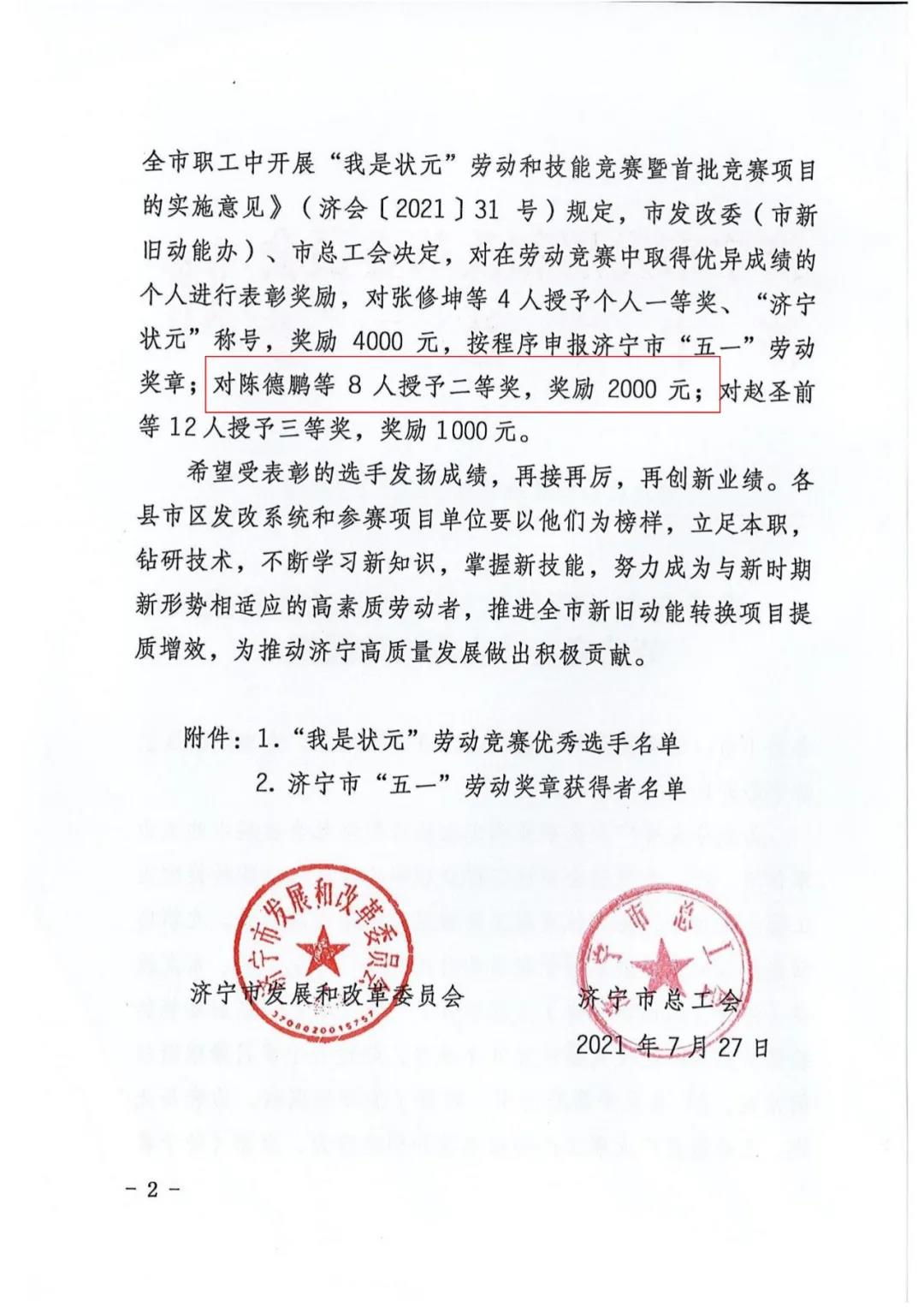 我司陳德鵬獲得濟(jì)寧市“我是狀元”勞動(dòng)競賽新舊動(dòng)能轉(zhuǎn)換重大課題攻關(guān)競賽單元二等獎(jiǎng)