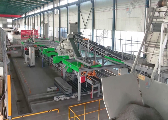 擠壓墻板生產(chǎn)線結構緊湊,自動化程度高,設備主機固定,墻板成型時物料受擠壓和振動同時作用,連續(xù)自動擠壓振搗成型,保證墻板具有良好的密實性和外形尺寸,成型后進行初凝養(yǎng)護。板坯移動方便,場地使用靈活、利用效率高。成型工段推料擠壓螺旋變頻調(diào)速,由中央控制器調(diào)整控制灰渣板成型的密實程度,實現(xiàn)灰渣板的連續(xù)自動流水線生產(chǎn)。由于采用低水灰比的干硬性混合料擠壓成型,可得到強度和密實度較高的空心墻板。自動化連續(xù)生產(chǎn),效率高,質(zhì)量一致性高,保障了墻板品質(zhì)。廣泛用于框架結構和鋼結構建筑物。